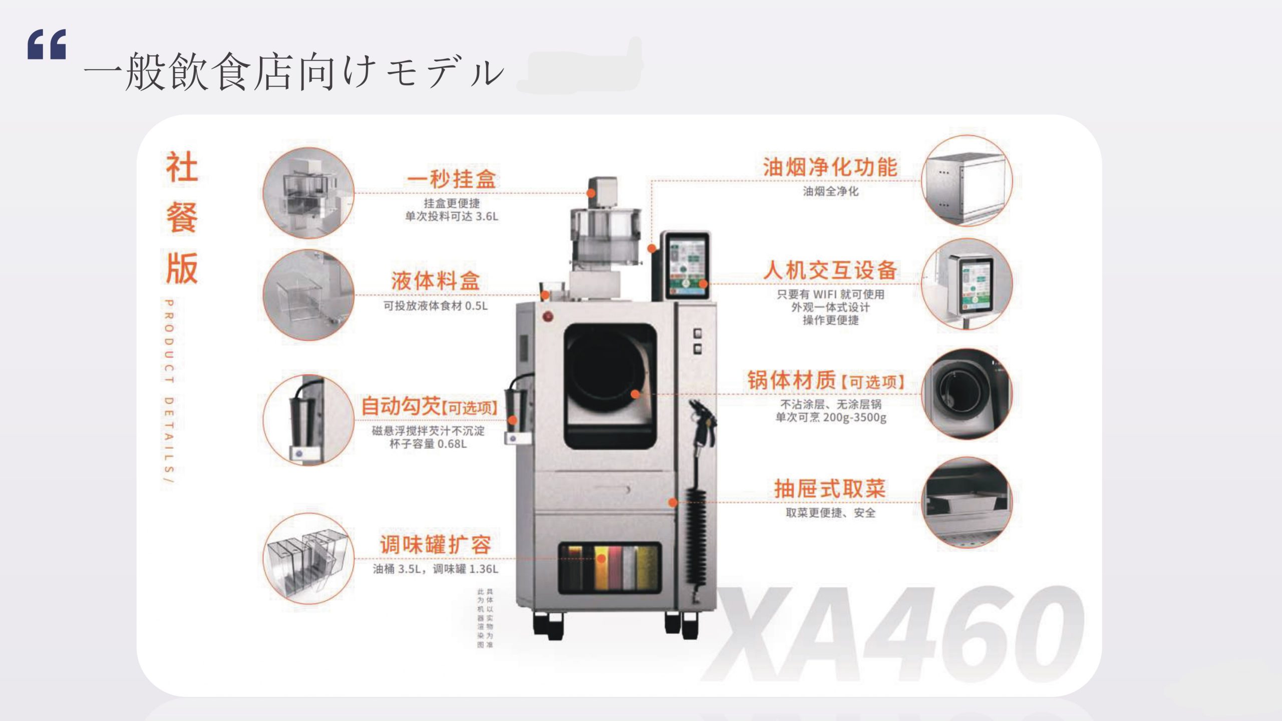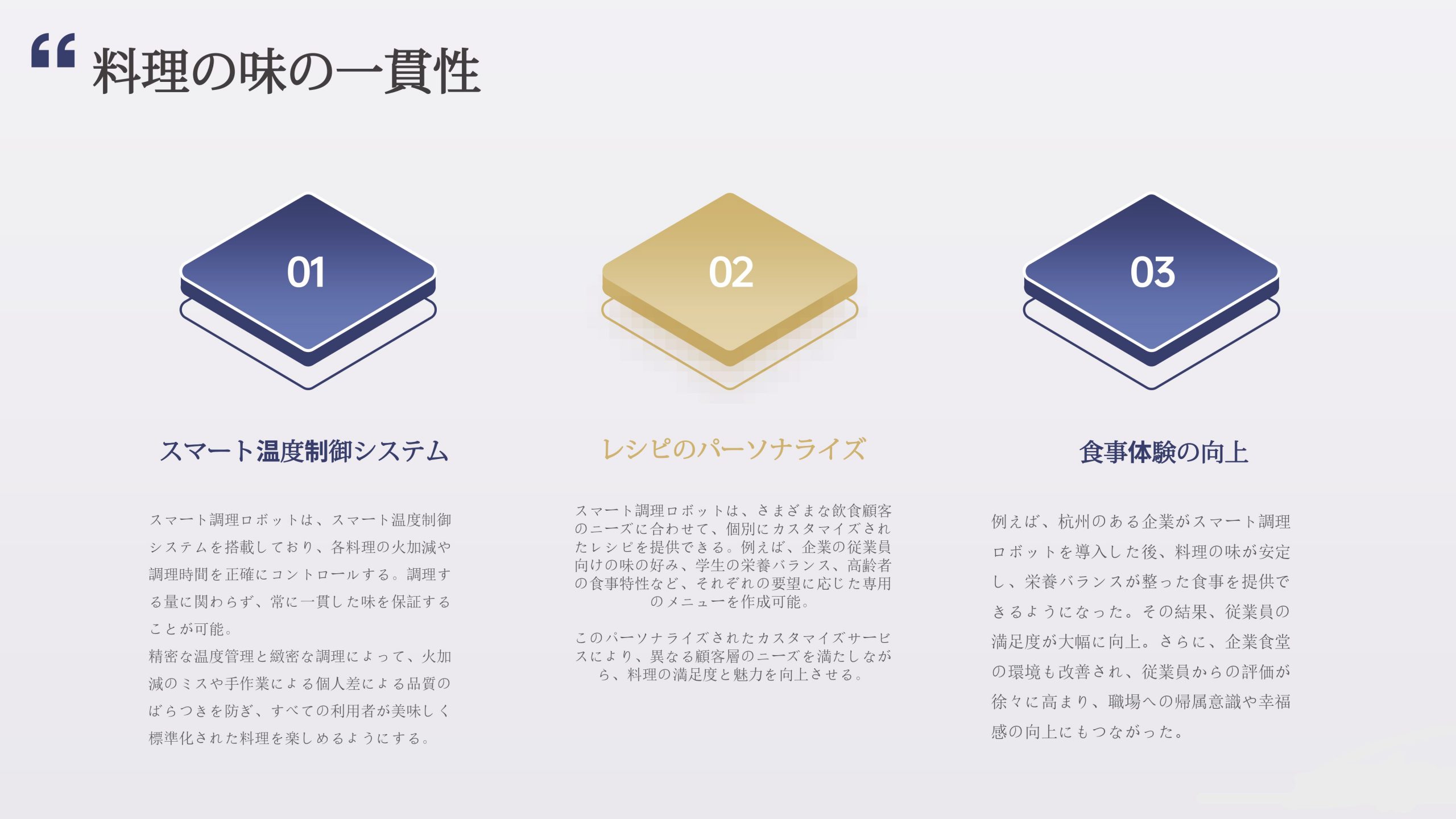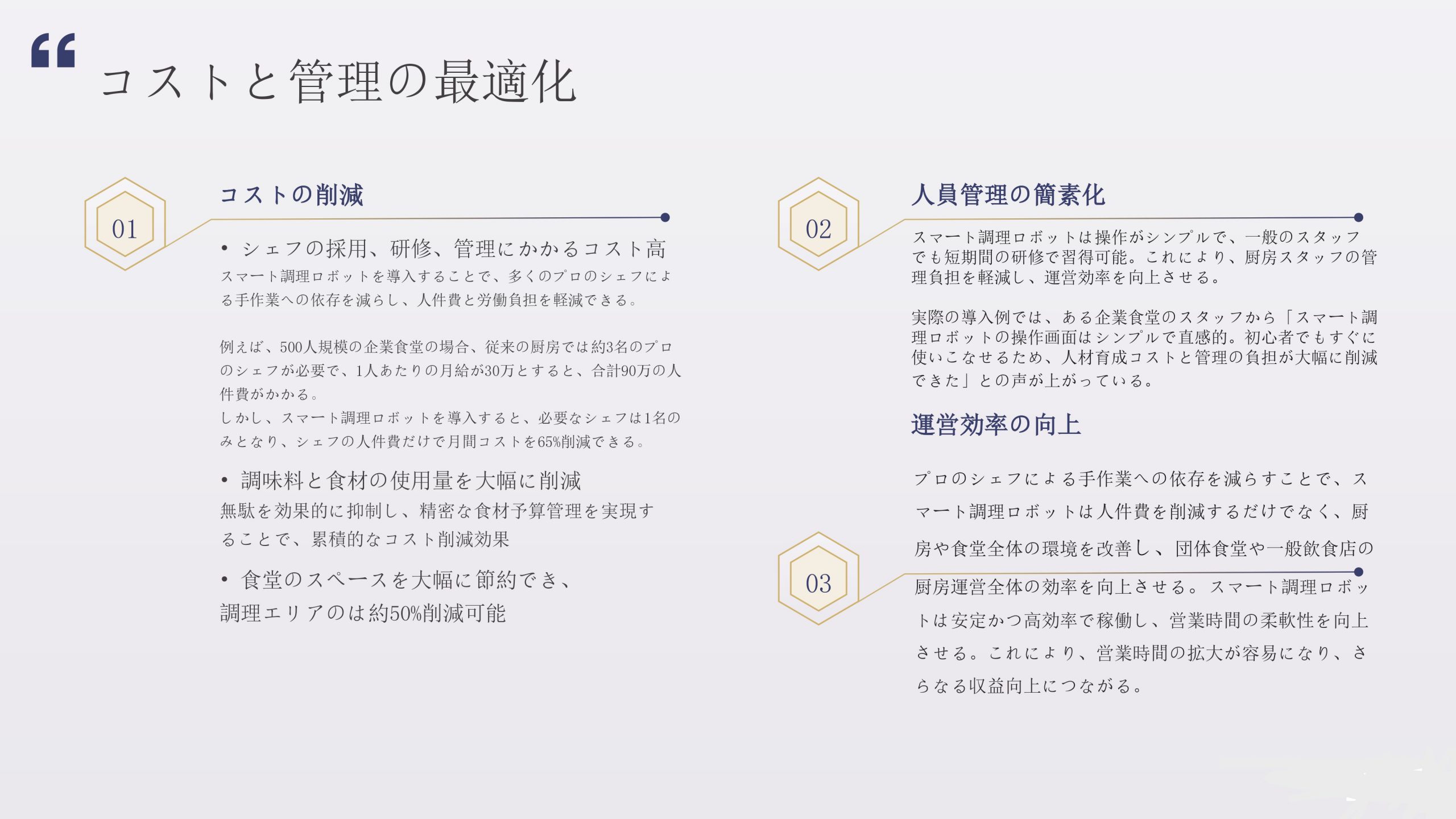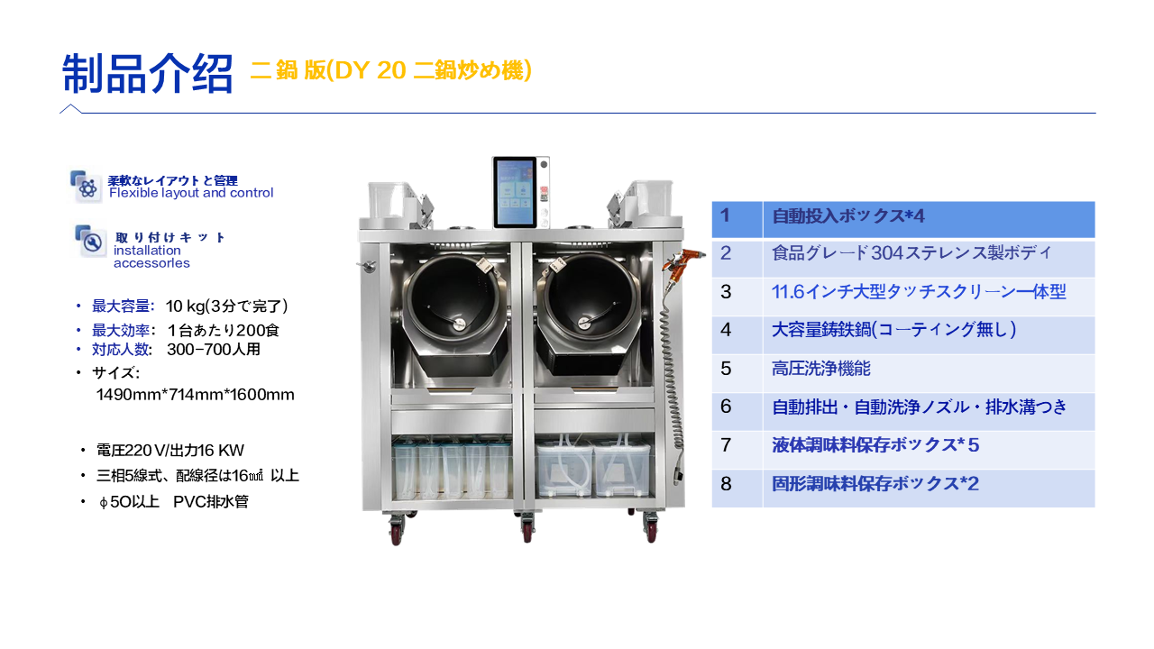 スマート調理ロボット スマート調理ロボット導入のメリット スマート調理ロボットを導入することで、厨房業務の自動化・効率化を実現。 人手不足の解消、味の均一化、省スペース運用に貢献し、飲食店のコスト削減とサービス品質向上を同時に叶えます。 次世代の飲食経営を支える革新的ソリューションです。