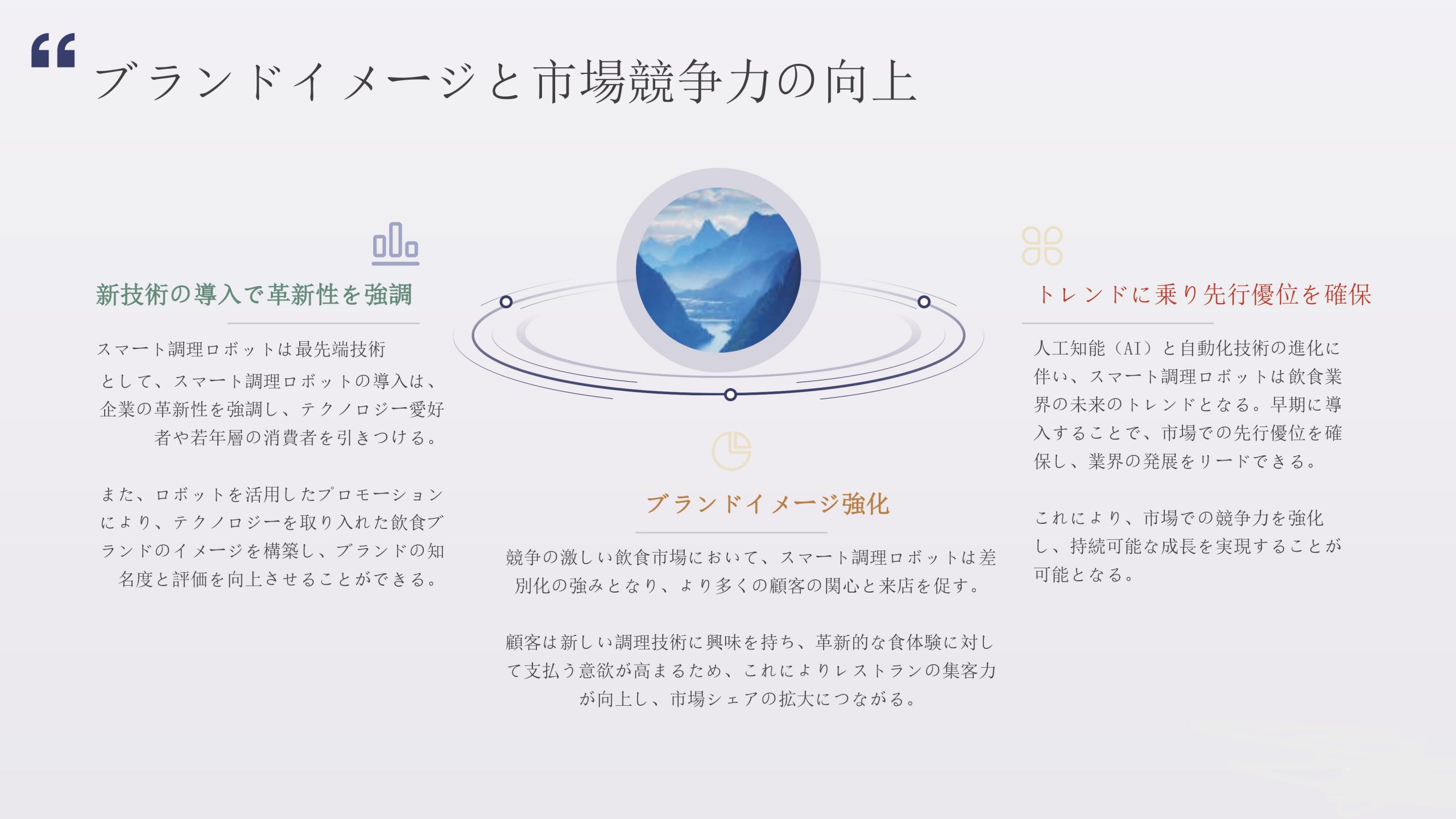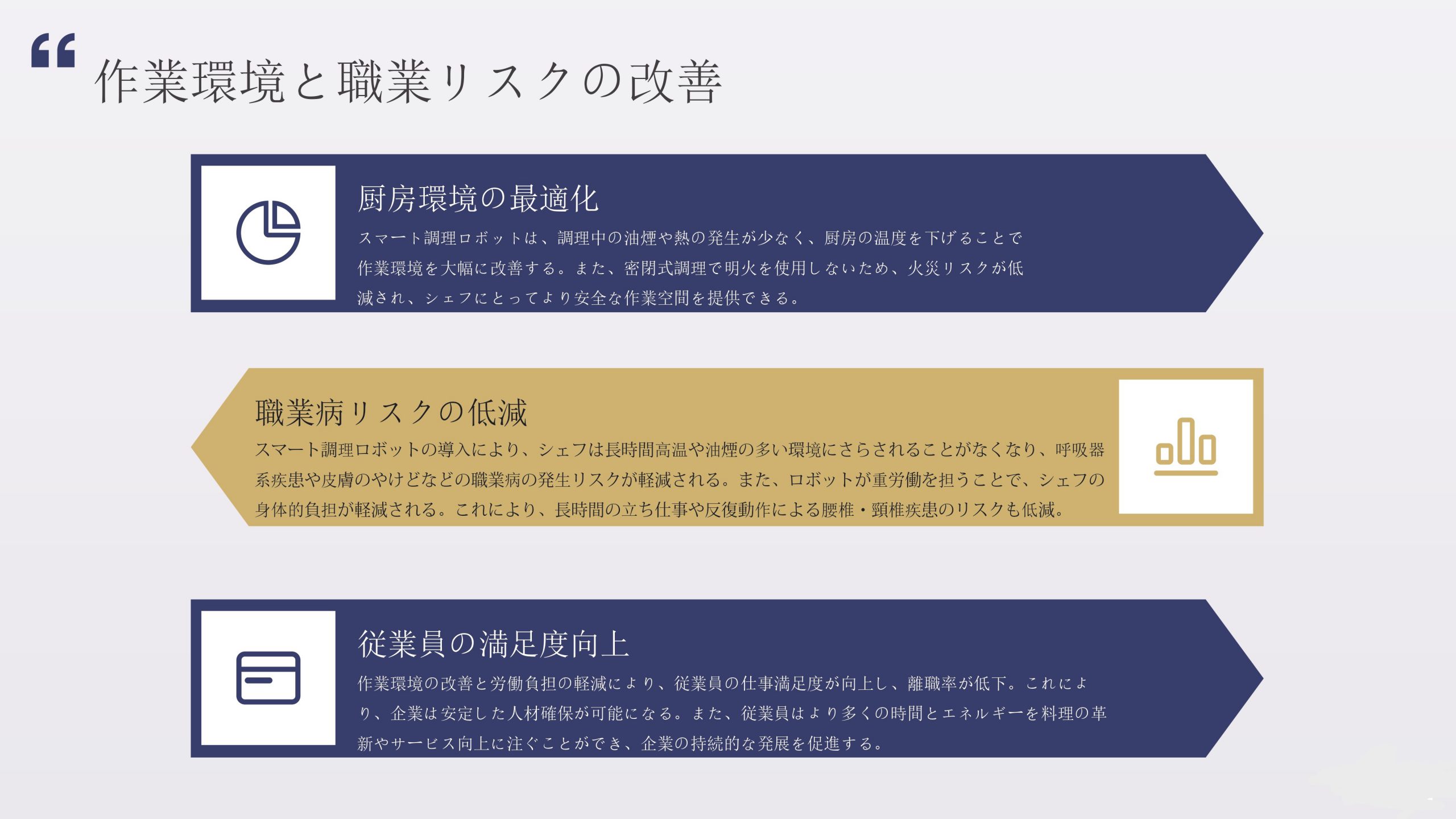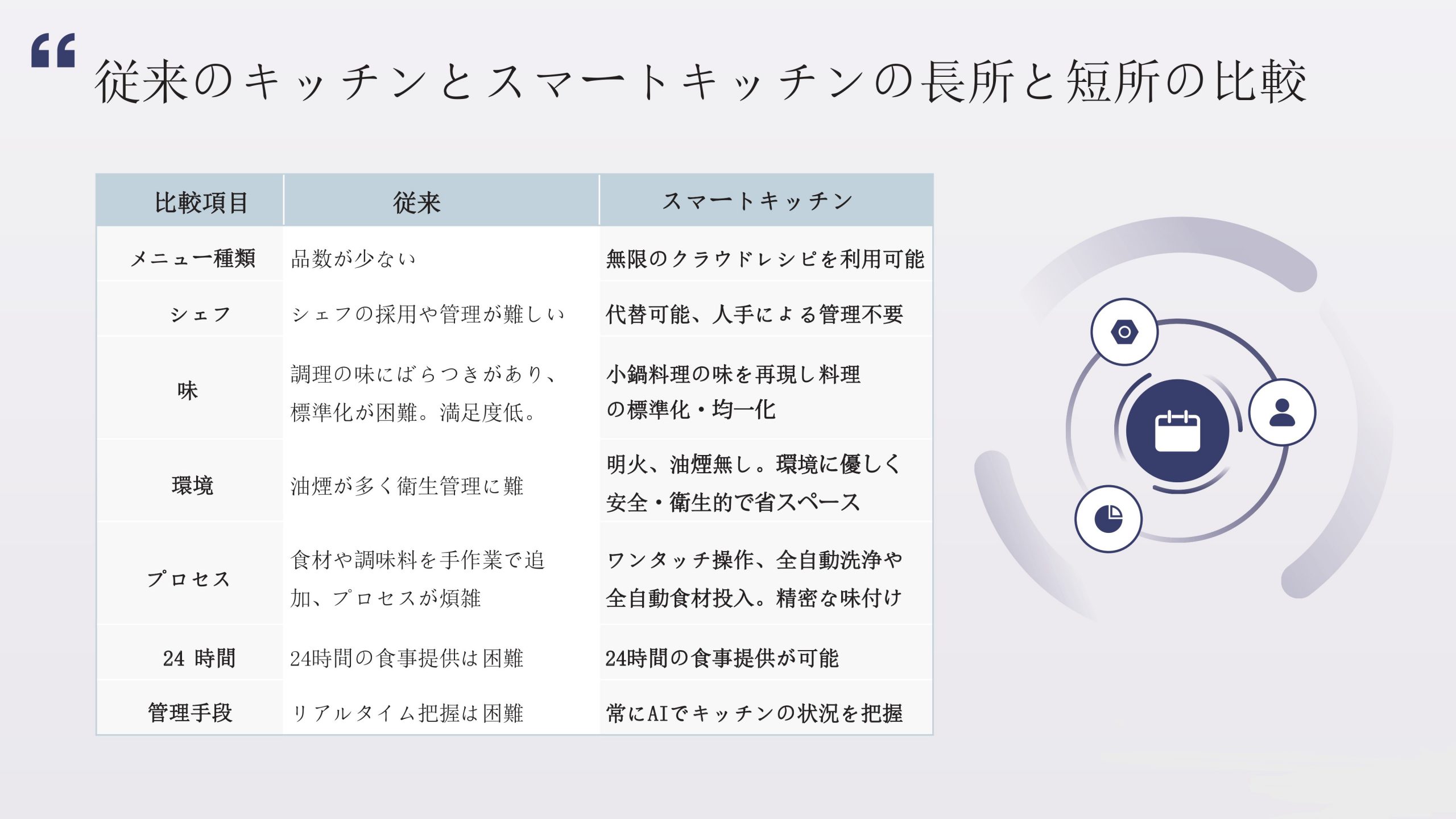 スマート調理ロボット スマート調理ロボット導入のメリット スマート調理ロボットを導入することで、厨房業務の自動化・効率化を実現。 人手不足の解消、味の均一化、省スペース運用に貢献し、飲食店のコスト削減とサービス品質向上を同時に叶えます。 次世代の飲食経営を支える革新的ソリューションです。